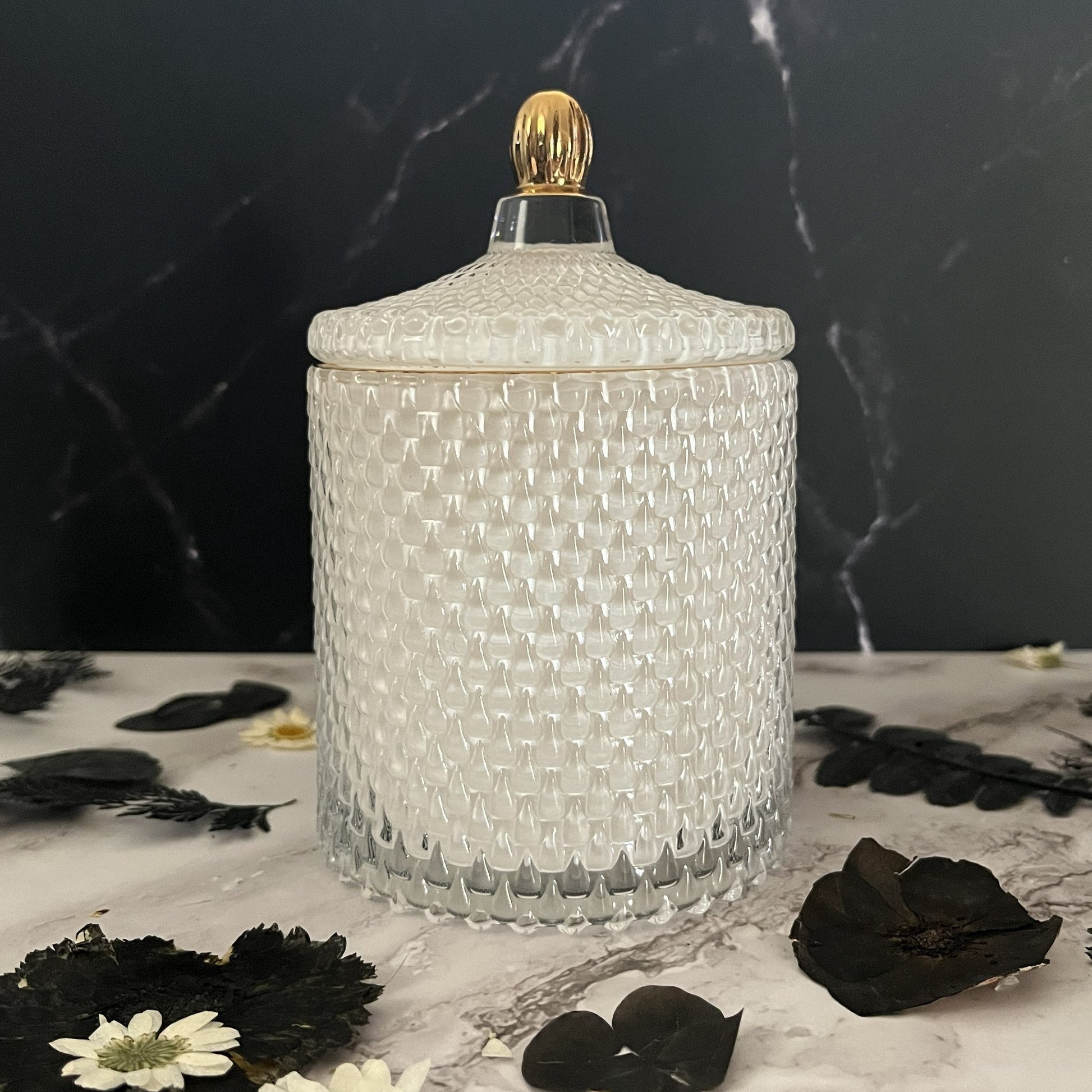 This 11 oz heavy glass vessel is not just a container; it is a statement piece with impeccable design details that adds a touch of majesty and sophistication to any space. Adorned with weaved texture and beautiful topper, it is a must-have for any discerning candle lover.
